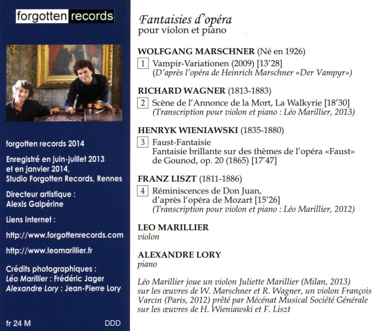 - Réminiscences de Don Juan, d'après l’opéra de Mozart (Transcription pour violon et piano : Léo Marillier, 2012) (Liszt)